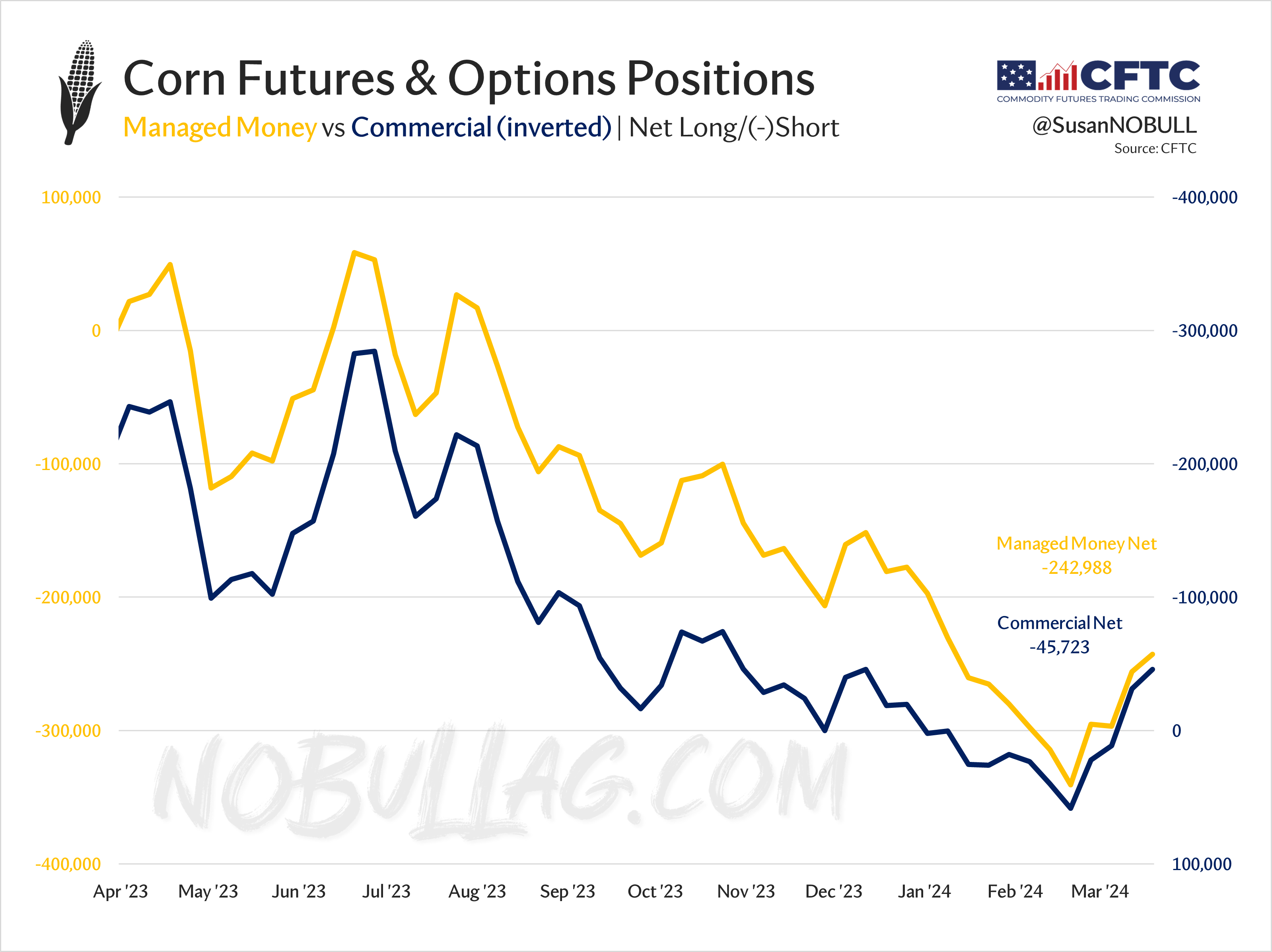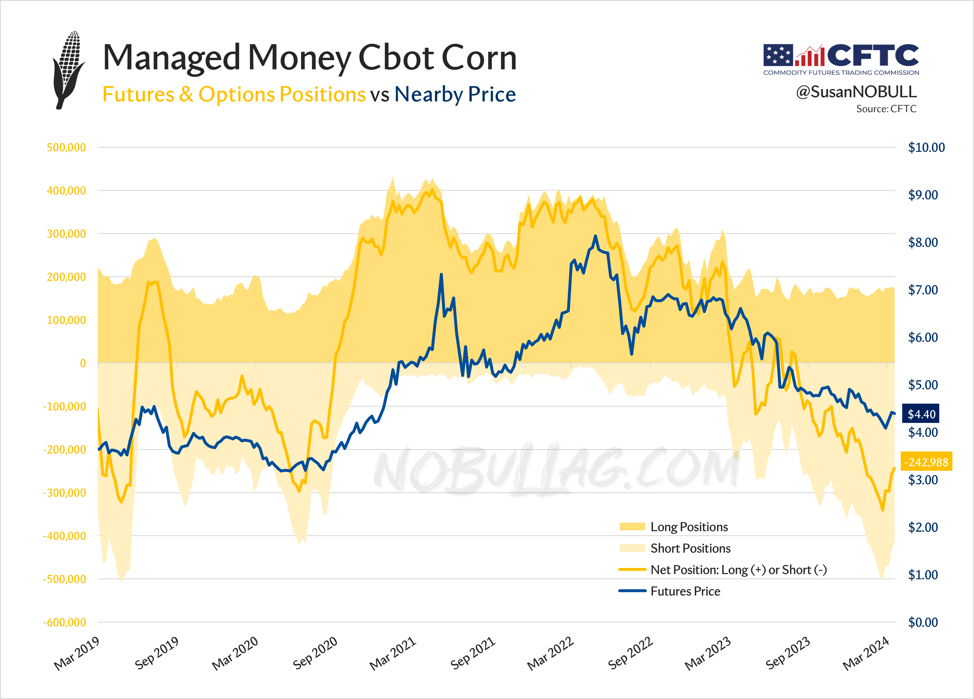 Managed money’s net corn short now sits nearly 100,000 contracts (500 million bushels) off their record short just one month ago but price action has been fairly muted as we have seen an uptick in producer selling during that time.