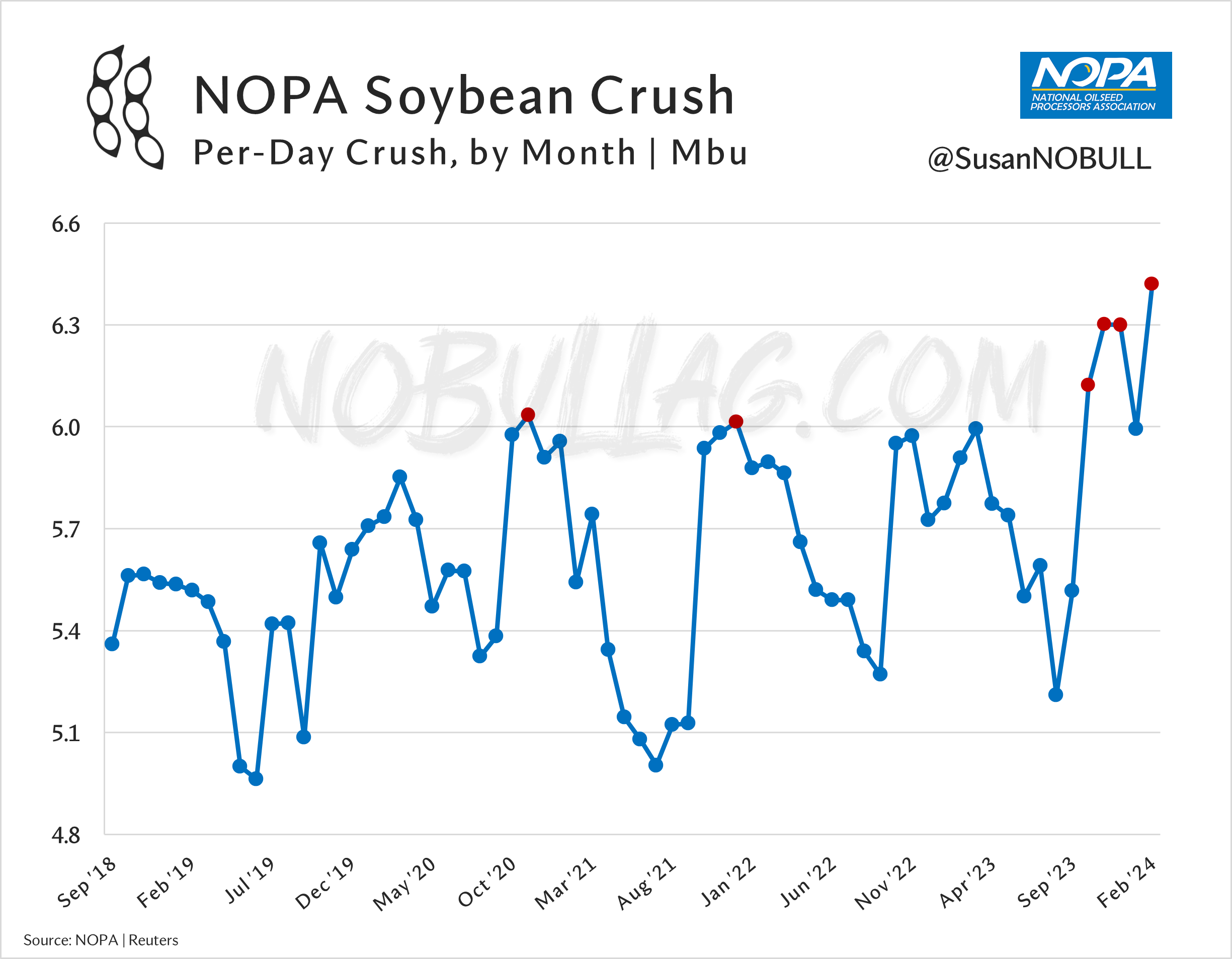 Even though February 2024 was two days shorter than January, NOPA members crushed a record 186.2 million bushels of soybeans - the sixth consecutive monthly crush record in a row while also hitting a new all-time high daily crush rate of 6.42 million bushels.