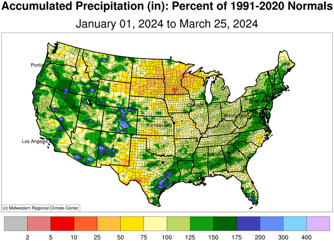 Perhaps more intriguing is the notable lack of precipitation in the Northern Plains and Upper Midwest thus far in 2024. While many want to look at this and scream DROUGHT, I look at it and see the potential for a lot of acres in the Dakotas.