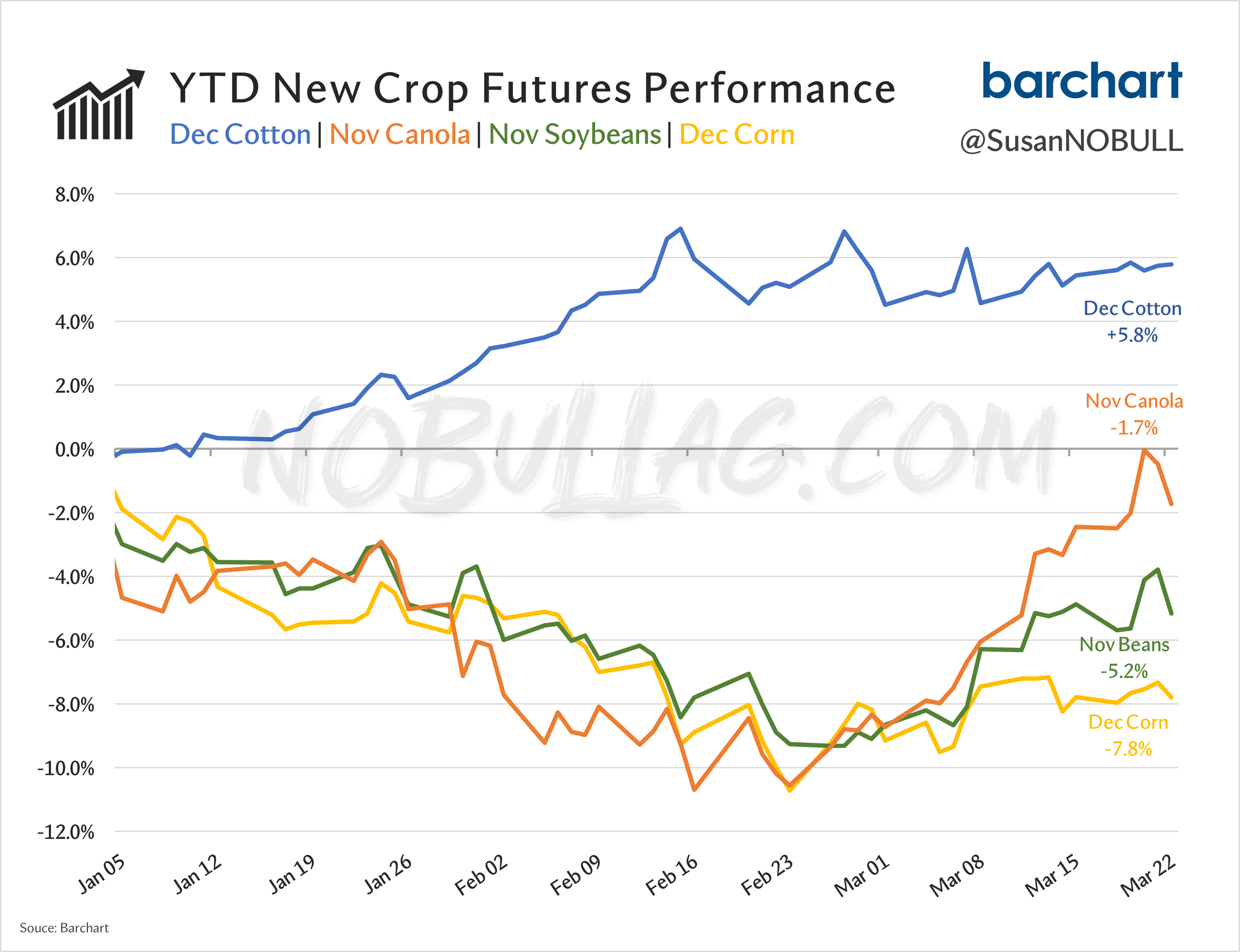 Cotton continues to maintain a strong performance year-to-date, compared with new crop corn and soybeans. Canola is interesting too as it sits more than 10% off of its late-February lows and only down 1.7% year-to-date (chart as of closes, 03/22/2024).