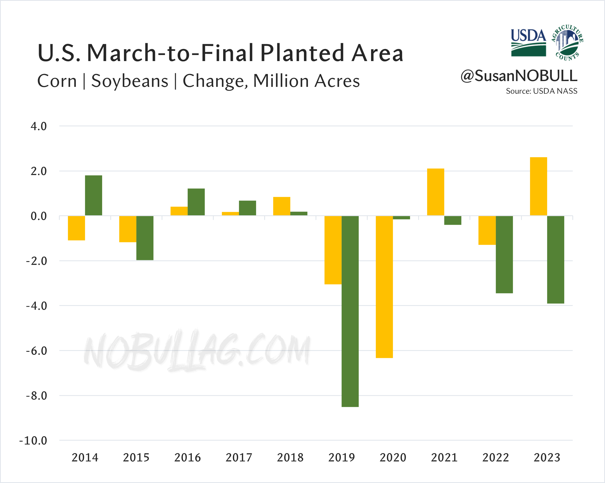 Below is a reminder that March’s Prospective Plantings acres (to be released on Thursday) are a far cry from final acres, in general.